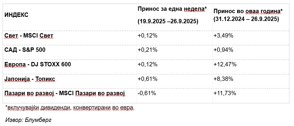 Макроекономските податоци објавени минатата недела укажуваат на континуиран, умерен економски раст во САД. Првичните проценки покажуваат дека расположението на менаџерите за набавки малку се влошило во септември, но и понатаму останува во опсег што укажува на економски раст. Инфлацијата, исто така, пораснала само минимално и покрај царините. Ова значи дека значителен дел од товарот од царините сè уште го носат увозниците, кои ги намалуваат своите маржи и извозниците, кои продаваат стоки на американскиот пазар по пониски цени.