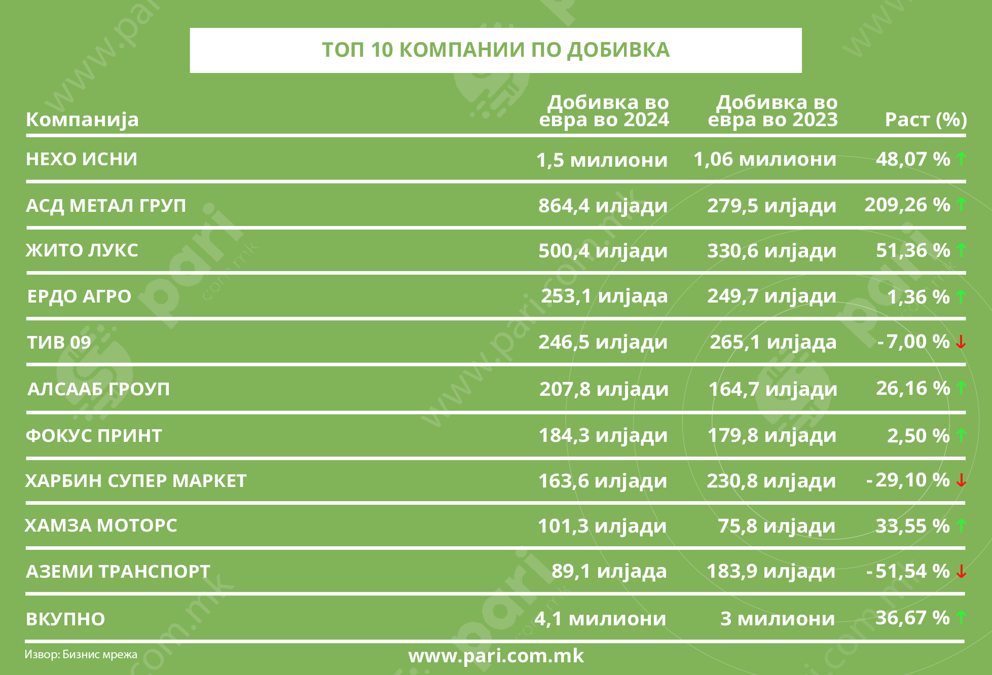 Најдобар профит во 2024 година остварува Нехо Исни, единствената компанија во општината со милионска добивка – 1,5 милиони евра, што е раст од 48,07 насто. Компанијата е производител на сладолед и производи од мраз, и веќе неколку години по ред покажува дека може да биде сериозен играч.