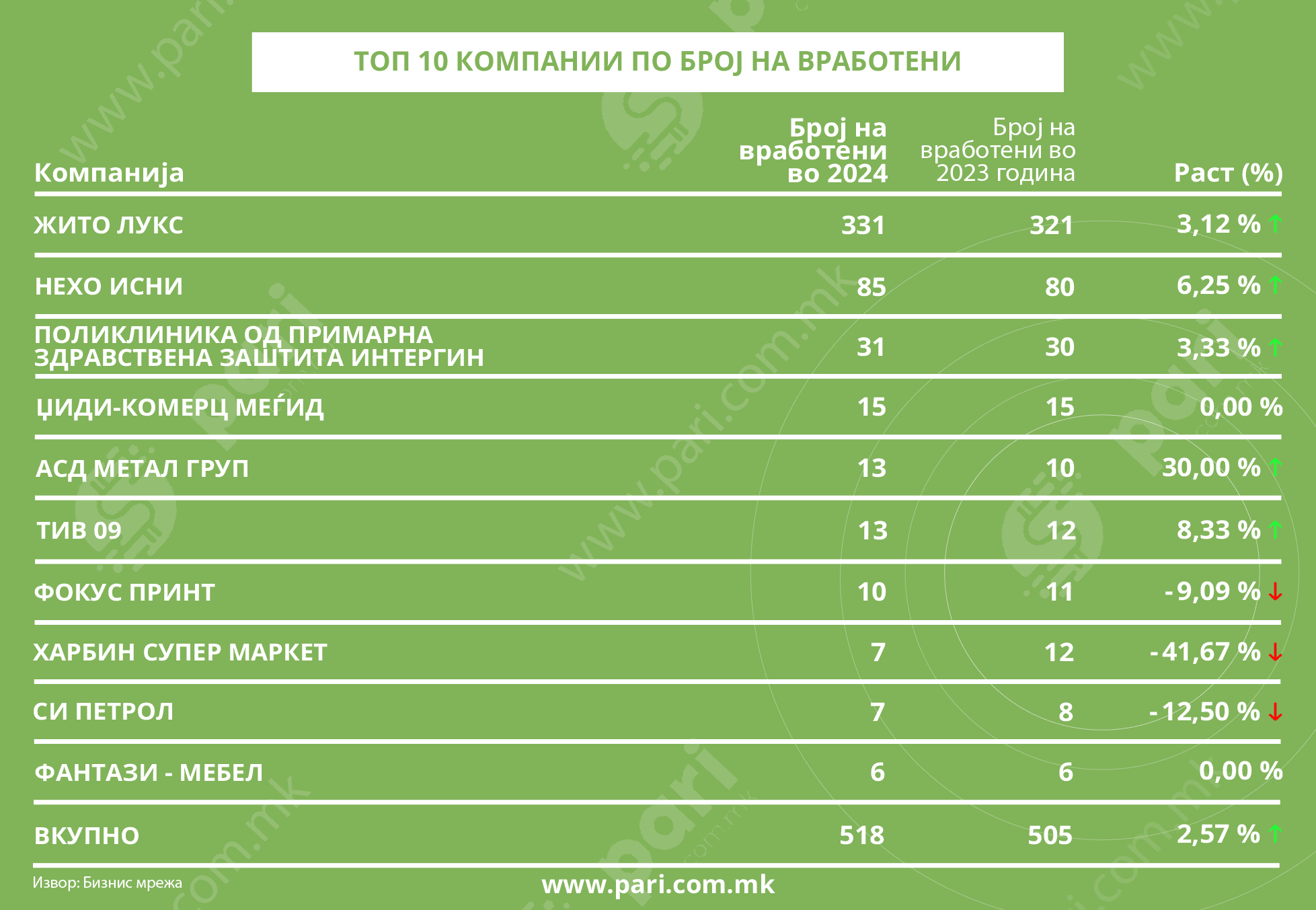 Некои фирми бележат пад во бројот на вработени ‒ како Харбин Супер Маркет (од 12 на 7), и Фокус Принт (од 11 на 10 вработени).