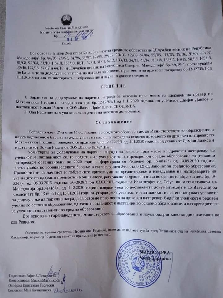 Роднини на талентираниот математичар велат дека немаат намера да поведат спор пред Управниот суд за да добие парична награда која изнесува 50 проценти од просечната плата, туку бараат државата повеќе да ги стимулира младите кои го докажуваат својот квалитет на официјални натпревари што самата ги организира. Тие додаваат дека во Законот за средно образование никаде не пишува дека ученикот мора да биде средно образование за да биде награден.