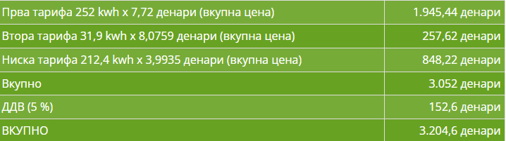 Пресметката ја направивме врз една реална фактура. Станува збор за потрошена струја за потребите и за затоплување со две инвертор клими за едно тричлено смејство во стан од 60 квадратни метри. Мерењата, според фактурата, се однесуваат за период од 17.11.2022 до 22.12.2022 година. Бидејќи станува збор за поголем пресметковен период од 30 дена, има и проширување на износот во блок-тарифи. Така, ЕВН пресметал повеќе киловати во блок-тарифата број 1, која за 30 дена предвидува потрошувачка од 210 киловат-часови. Во конкретниов случај, во првата тарифа се признати 252 киловати. Во втората тарифа се потрошени 31,9 киловат-часови, а во ниската тарифа 212,4 киловат-часови. Цената за струјата, заедно со нејзиниот пренос и дистрибуција, во конкретниов случај е пресметана 3.052 денари без ДДВ, односно со ДДВ од 5 проценти, сметката е 3.204,6 денари.