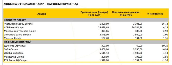 Согласно податоците во него, во прилог ТОП 5 акции со најголем пораст и пад на берзата во месец март..