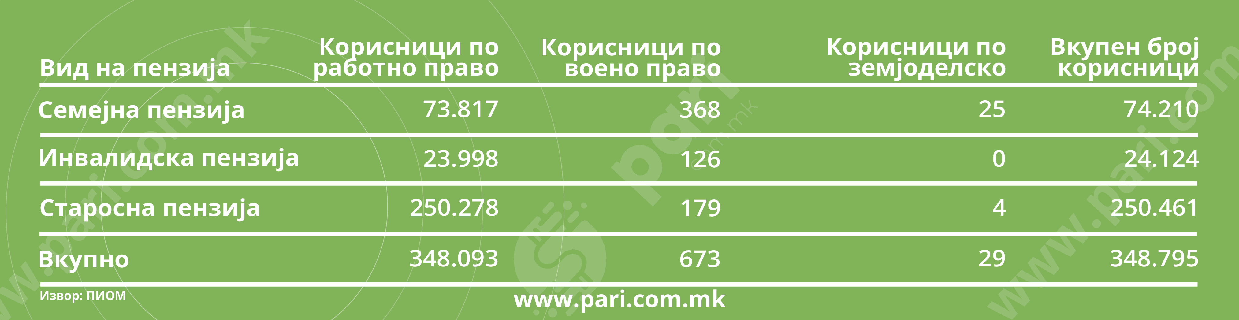 Тие покажуваат дека од вкупниот број корисници, 250.461 лице примаат старосна пензија, што претставува убедливо најголем сегмент. Семејна пензија користат 74.210 лица, додека инвалидска пензија примаат 24.124 корисници. По основ на воено и земјоделско право пензии примаат значително помал број лица – вкупно 702 корисници, што е симболичен удел во вкупната структура. Најголемиот дел од пензиите се остварени врз база на претходниот работен однос.