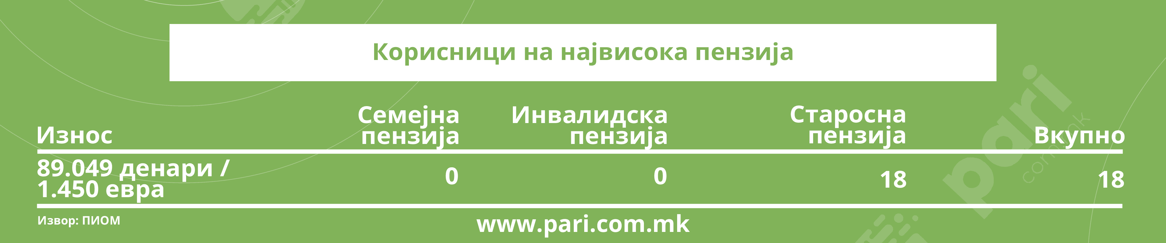 Највисоката исплатена пензија во декември изнесува 89.049 денари (околу 1.450 евра). Ја примаат 18 лица, сите по основ на старосна пензија. Во категориите семејна и инвалидска пензија нема корисници со ваков износ.