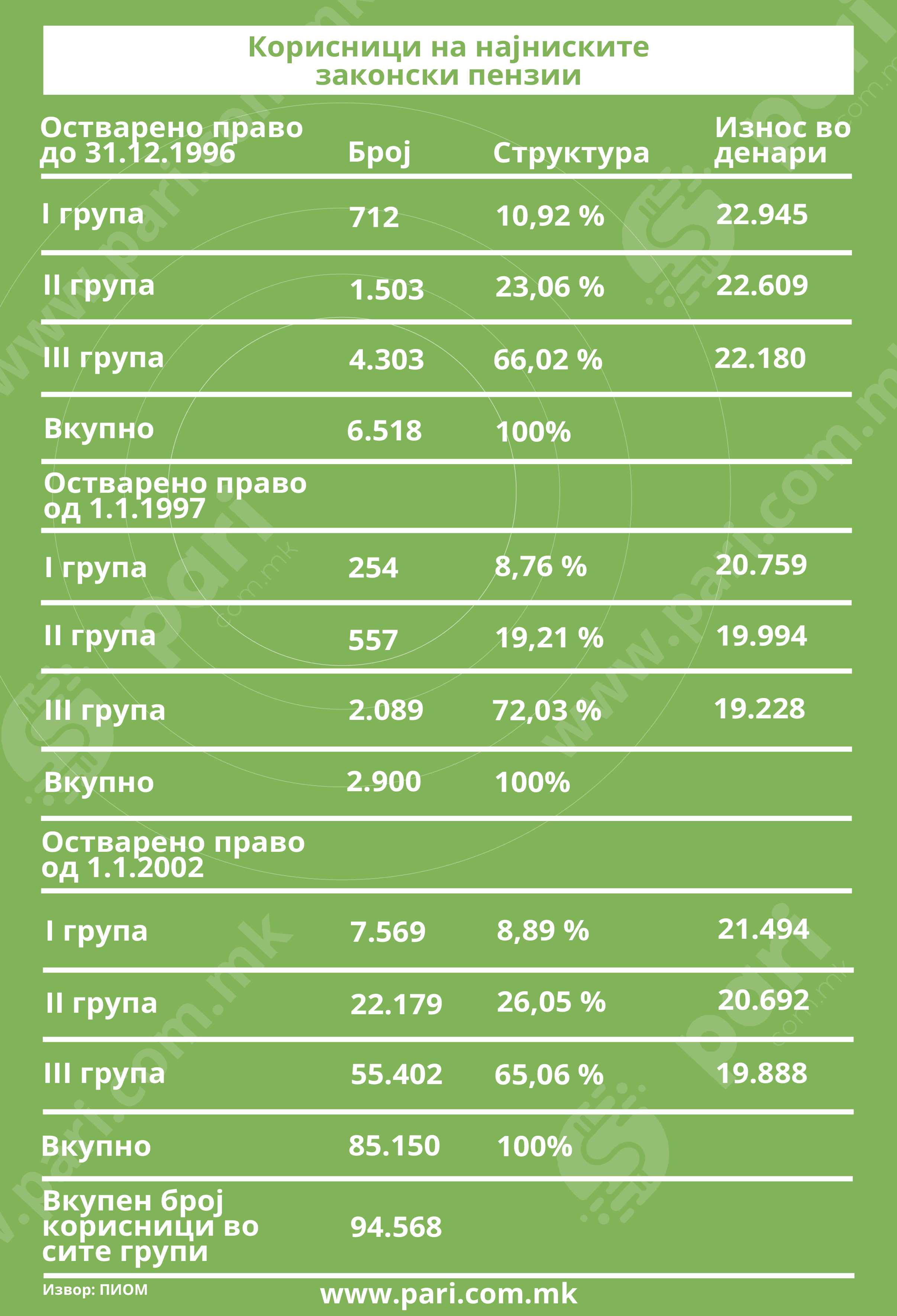 Според податоците на ПИОМ, 94.568 пензионери живеат со најниските законски пензии, предодредени со периодот кога го оствариле тоа право. Најголемиот дел, или 85.150 лица се пензионирале по 1 јануари 2002 година. Во овој дел доминантна е третата група од 55.402 лица со најнизок износ на примања од 19.888 денари.