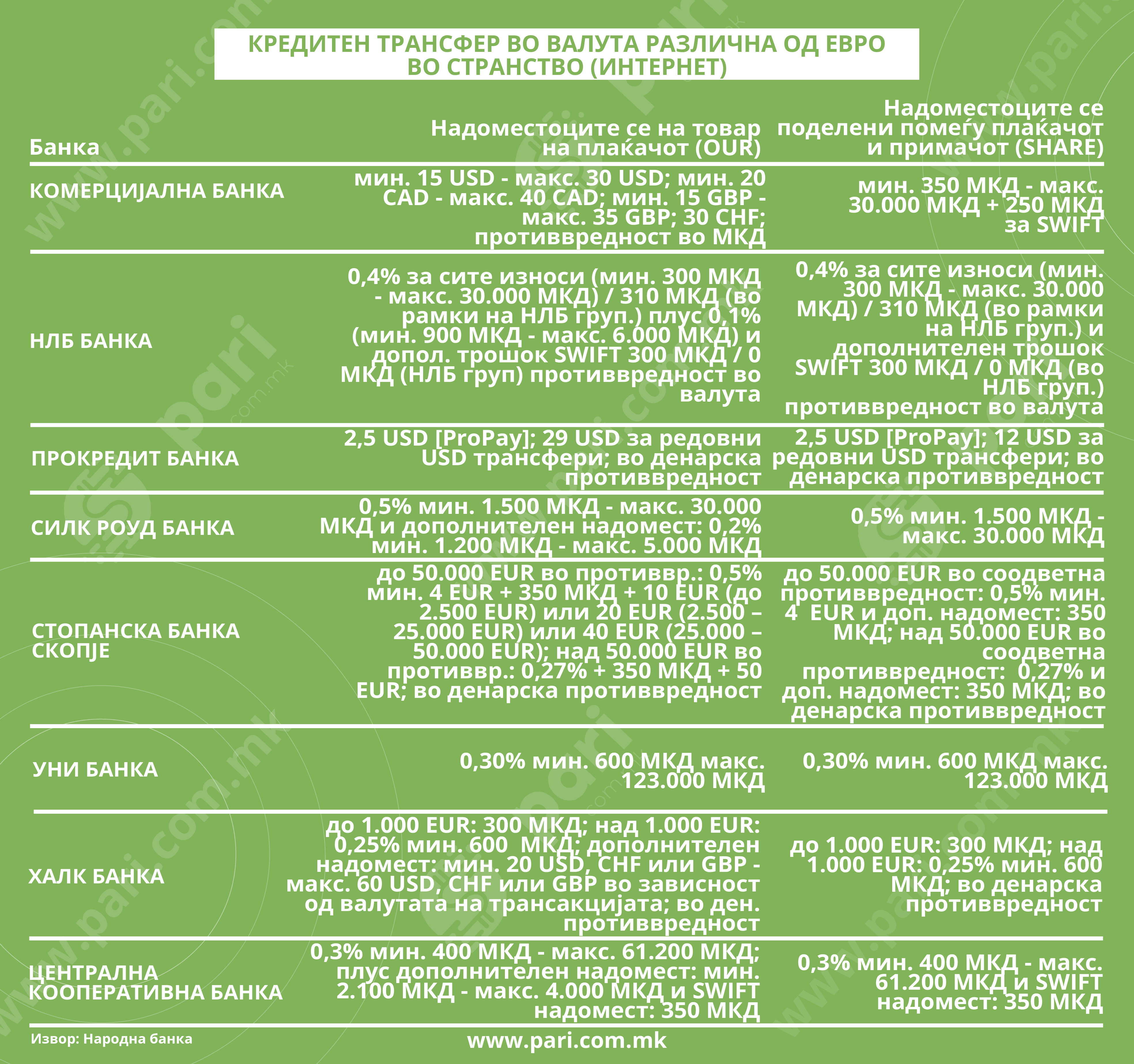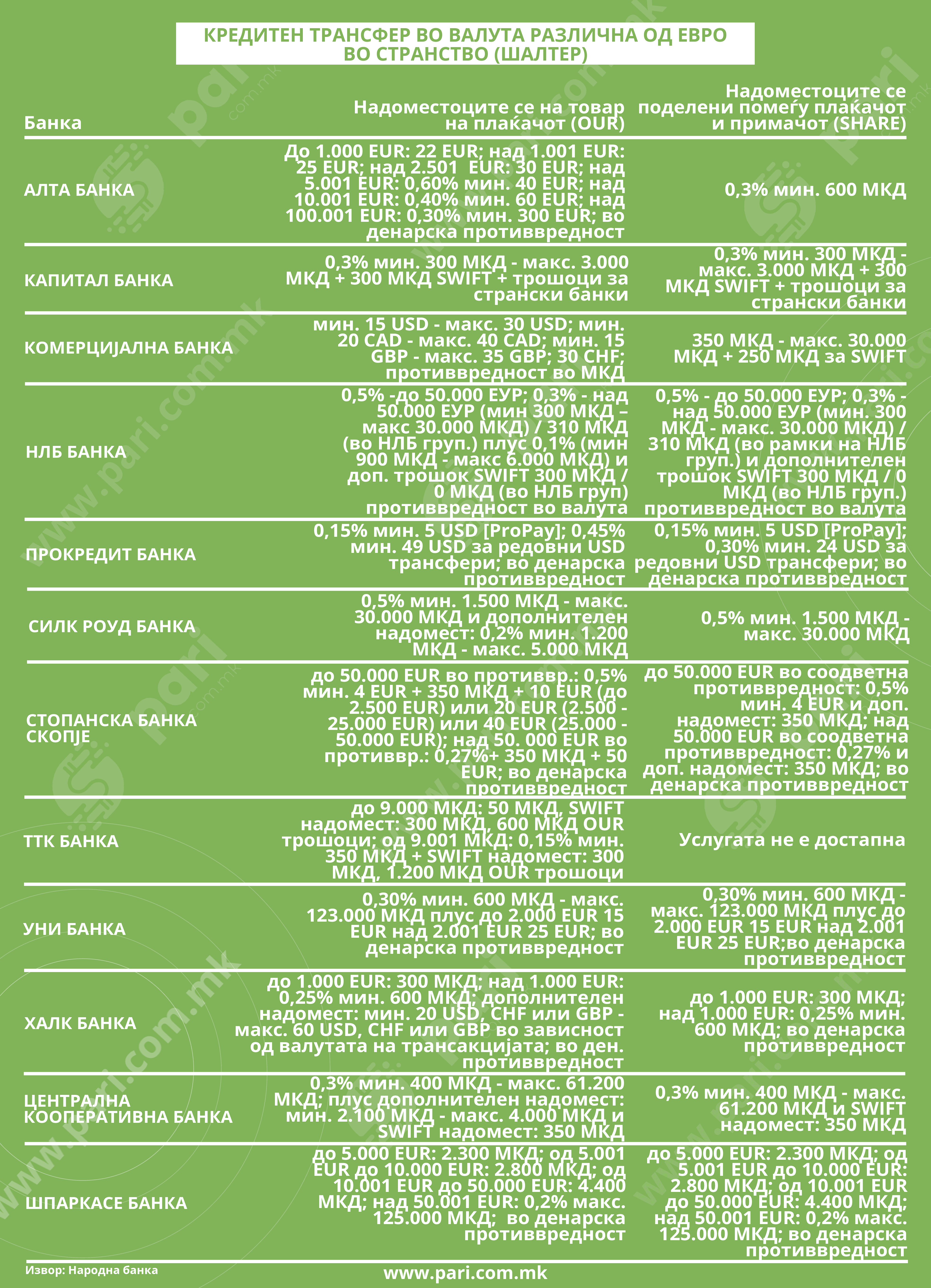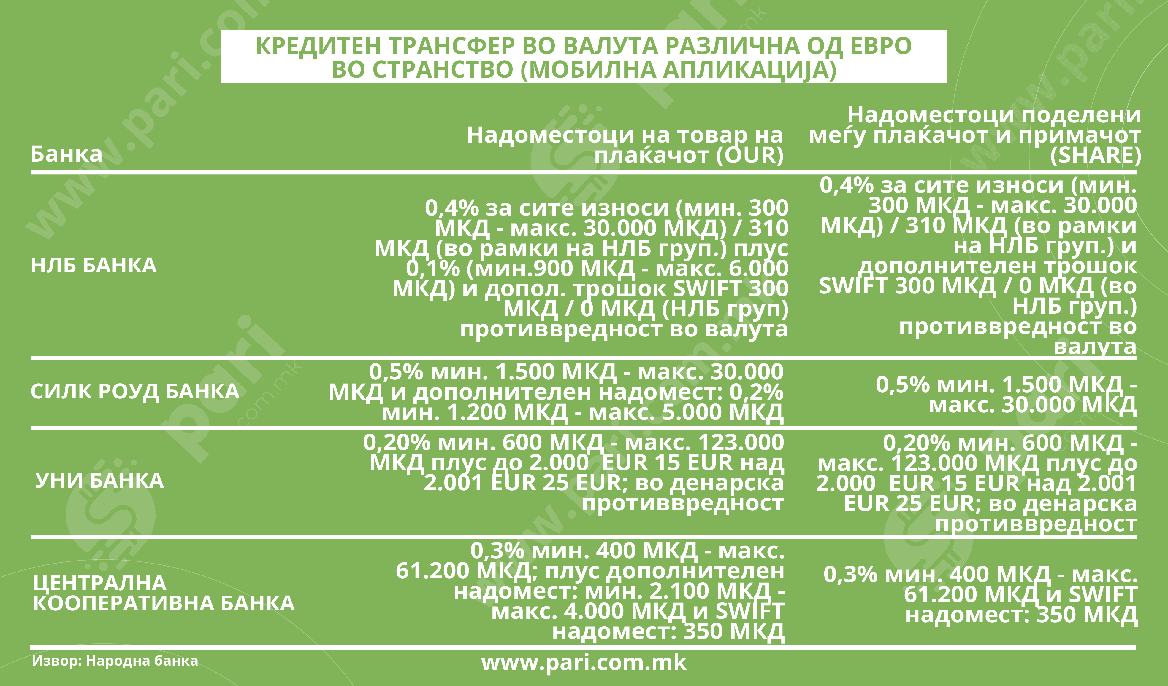 НЛБ банка применува 0,4 проценти од износот (300–30.000 денари), а кај OUR се додаваат дополнителни 0,1 процент (900–6.000 денари) и 300 денари SWIFT, освен во рамки на НЛБ групацијата.