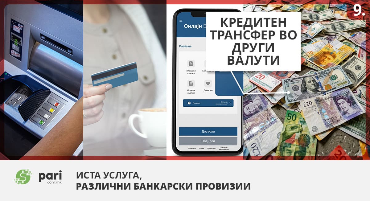 И кај останатите банки – Комерцијална, НЛБ, ПроКредит, Силк Роуд, Стопанска Скопје, УНИ, Халк и ЦКБ, шалтерските трансфери вклучуваат процентуален надомест со минимални нивоа и дополнителни SWIFT или валутни трошоци.