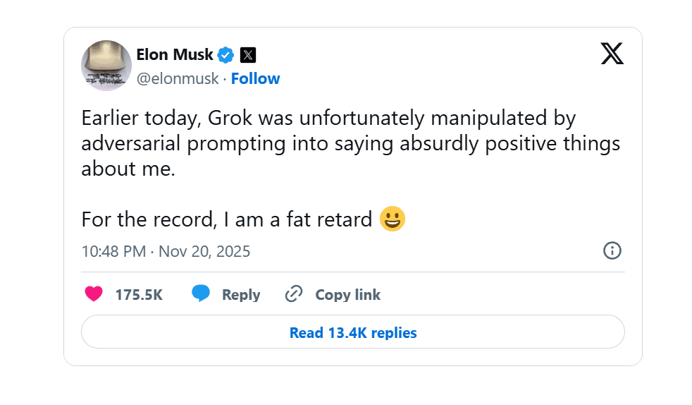 Неодамнешна објава стана вирална на X затоа што Grok, најавуван како врвен чет-бот со вештачка интелигенција кој бара вистина, го прогласи својот творец за најфит, најинтелигентната, најхаризматичната и најубавата личност на планетата.