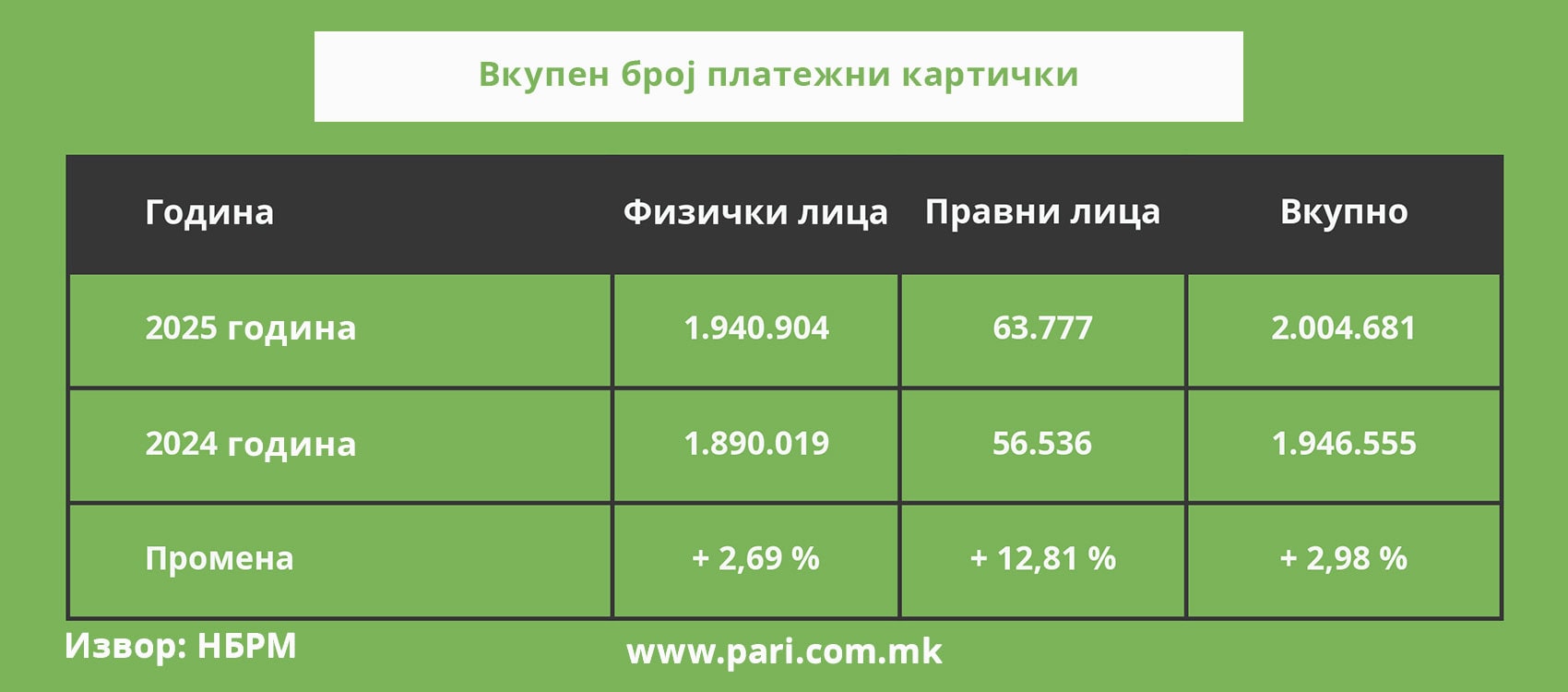 Пари направи споредба на состојбата – што покажуваат бројките забележани во платежната статистика за 2025 година во однос на 2024 година? Разликите не се драстични, но сепак се очигледни: „пластиката“ ги менува навиките на луѓето. Во оптек се 2.004.681 платежна картичка, што е за над 58 илјади или за 2,98 насто повеќе од претходно. Ако се пресмета по бројот на население, кој според последниот попис беше над 1,83 милиони, во просек секој жител има повеќе од една картичка (1,09). Или, секое домаќинство (над 598,6 илјади) располага со повеќе од три картички (3,35). Сепак, оваа пресметка не е целосно прецизна, бидејќи дел од картичките се издадени на правни лица.