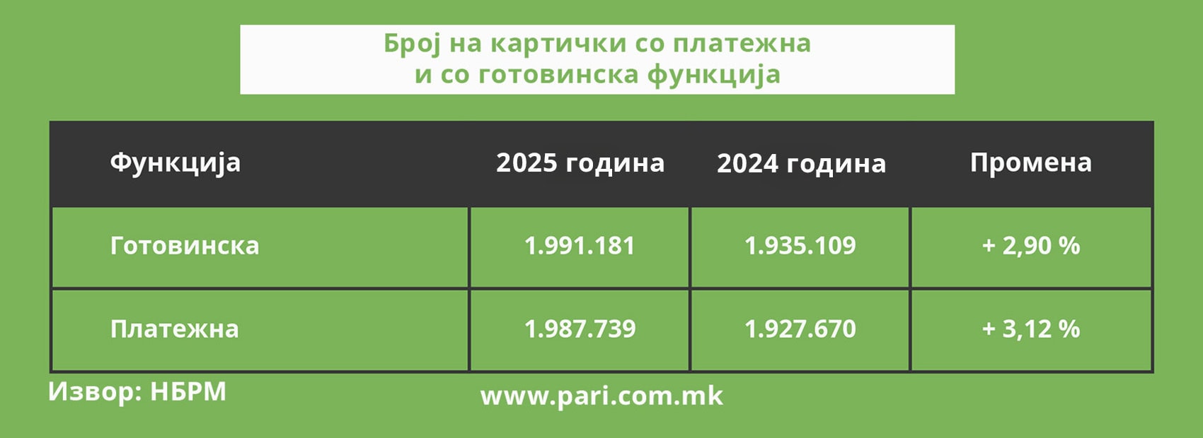 Кај картичките со готовинска функција, бројот достигнува 1.991.181 и е за 2,90 насто поголем во однос на крајот од 2024 година. Кај граѓаните растот е 2,60 насто (1.927.423), а кај компаниите 12,85 насто (63.758).