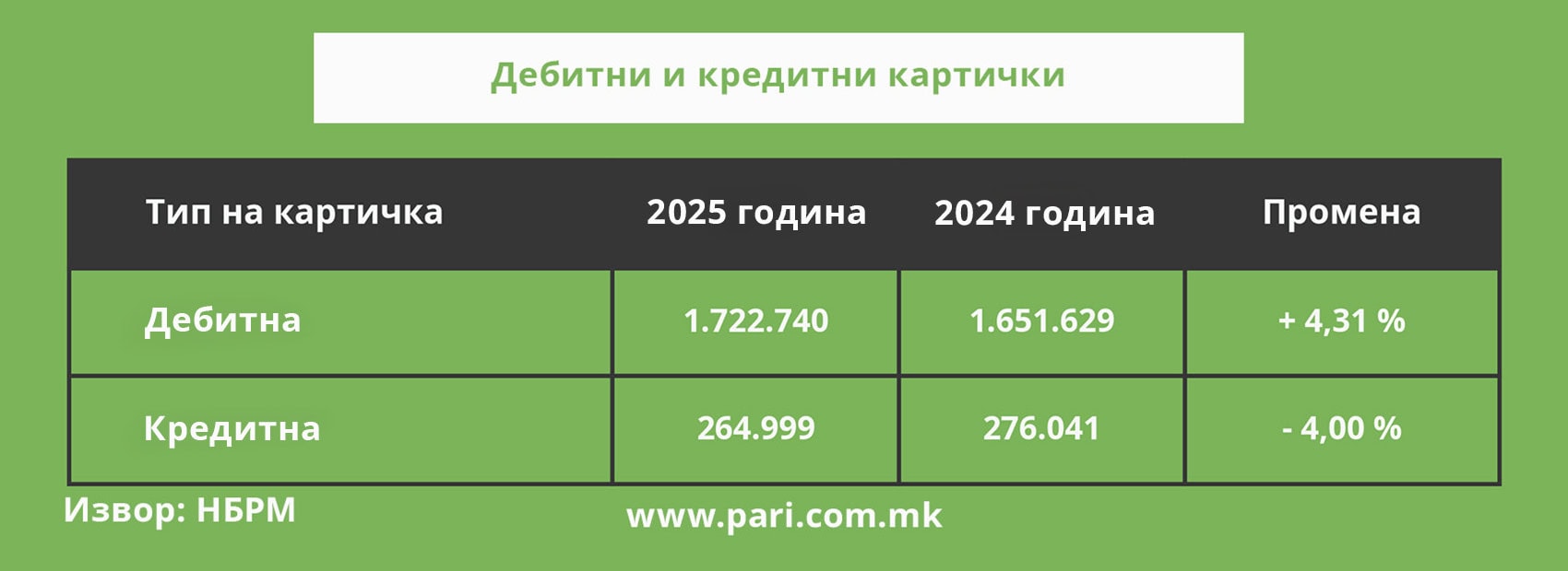 Картичките со платежна функција (без електронски пари) бележат раст од 3,12 насто. Минатата година во употреба биле 1.987.739. Во оваа категорија, имателите – физичките лица станале побројни за 2,83 насто (1.924.271), а правните за 12,73 насто (63.468). Внатрешната структура открива важен тренд – дебитните се во подем за сметка на кредитните картички. Впрочем, тоа веќе извесно време се потврдува и преку месечните информации од НБРСМ за монетарните движења, во кои е присутен трендот на пад кај задолженоста на граѓаните по основ на кредитните картички. На пример, во февруари годишната промена беше минус 5,1 насто.