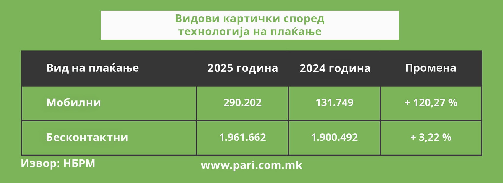 Најголемите поместувања се поттикнати од новите технологии. Картичките што овозможуваат мобилни плаќања се побројни за дури 120,27 насто и веќе ги има 290.202. Од своја страна, тоа упатува на забрзана дигитална трансформација на плаќањата.