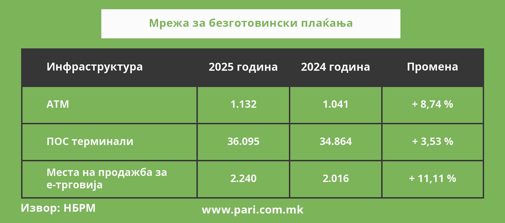 Овој раст го следат и банките и трговците, кои ја надградуваат и прошируваат неопходната инфраструктура. Бројот на банкомати (АТМ) е зголемен за 8,74 насто и низ државата се распоредени 1.132. Притоа, сè повеќе уреди нудат дополнителни функции, како внесување готовина (449), кредитни трансфери (541) и бесконтактно плаќање (664).