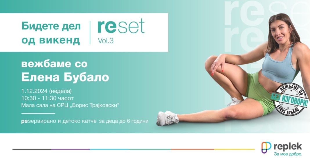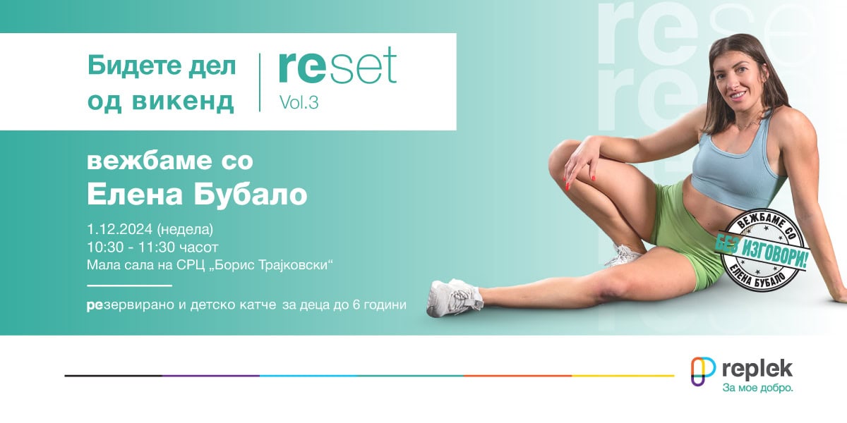 „РЕсет“ настанот е во организација на Реплек, а како и на претходниот, покрај можноста за вежбање со искусната инструкторка Бубало, ќе биде поставено и детско катче со спортски реквизити за деца до 6 години, додека поголемите деца ќе можат слободно да се приклучат и да вежбаат заедно со своите родители. Во рамките на „РЕсет“ настанот, Реплек обезбедува соодветна опрема и освежување за сите кои ќе вежбаат.
