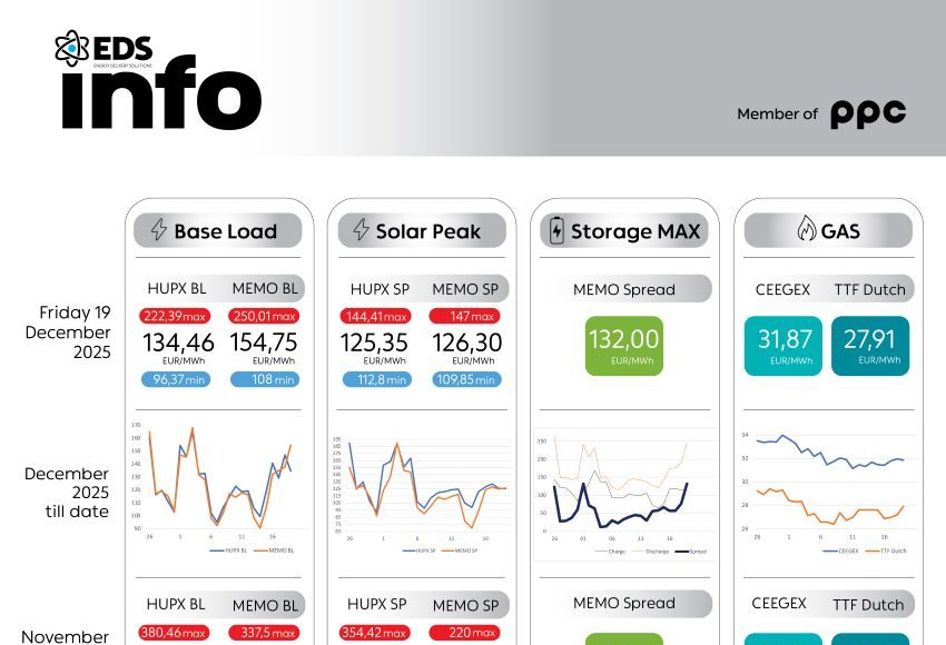 Цената на електричната енергија во текот на дневните часови (9:00 – 15:00) (Power solar peak) на HUPX постигна ниво од 125,35 евра за мегават час, а на MEMO 126,30 евра.