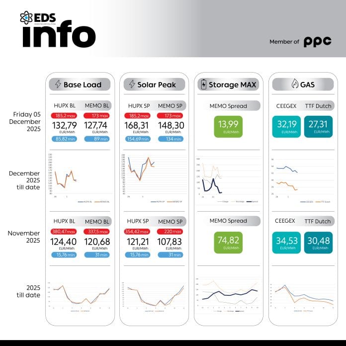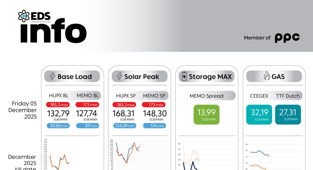 Согласно податоците за движењето на цените на берзата HUPX во Унгарија за 05 декември просечната часовна цена на еден мегават час електрична енергија (baseload) изнесува 132,79 евра/mwh, додека на Македонската берза за електрична енергија цената е 127,74 евра/mwhЕДСЦената на електричната енергија во текот на дневните часови (9:00 – 15:00) (Power solar peak) на HUPX постигна ниво од 168,31 евра за мегават час, а на MEMO 148,30 евра.