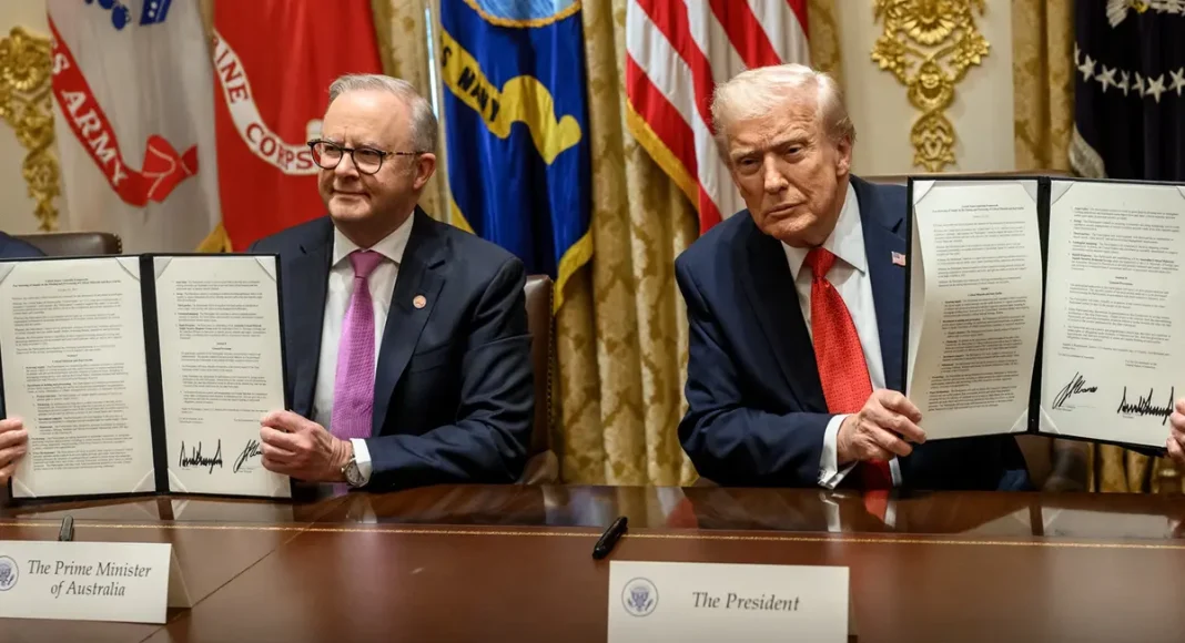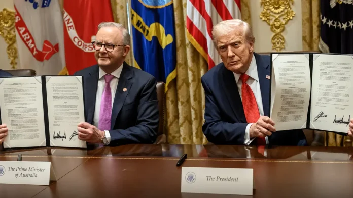 САД и Австралија потпишаа нов стратешки договор за зголемување на залихите на ретки земни метали и други критични минерали, со што двете земји ја зацврстуваат својата соработка во време на растечки економски и геополитички тензии со Кина. Потпишувањето се одржа во Белата куќа, каде што американскиот претседател Доналд Трамп и австралискиот премиер Ентони Албанезе се ракуваа по официјализирањето на рамковниот документ што ја означува новата фаза на економско и безбедносно партнерство меѓу сојузниците.