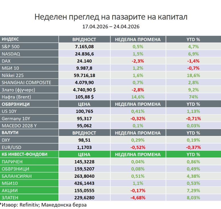 На макроекономски план, малопродажбата во САД во март порасна за 1,7% (или 0,6% без продажбата на гориво), што укажува на солидна потрошувачка, иако индексот на доверба на потрошувачите се намали, a инфлациските очекувања пораснаа на 4,7%. Надвор од САД, STOXX Europe 600 опадна за 2,54%, додека јапонскиот Nikkei 225 порасна за 2,12% и продолжи да бележи рекордни нивоа. Во останатите сегменти, приносите на американските државни обврзници се зголемија, цената на нафтата порасна за околу 13%, златото ослабе, а американскиот долар умерено зајакна.