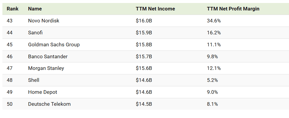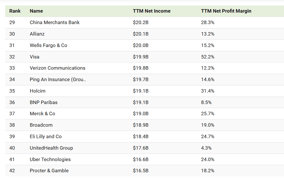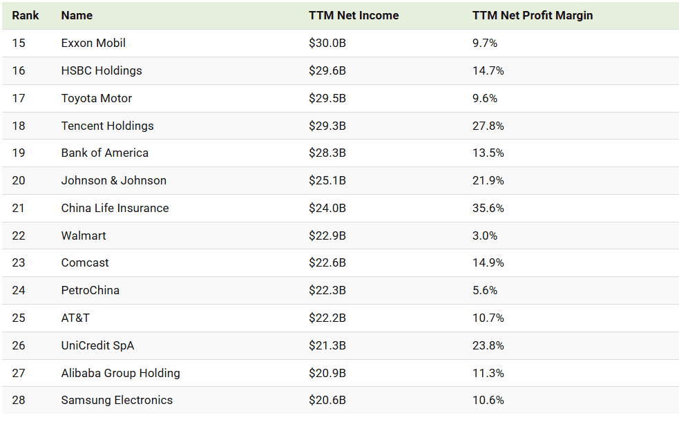 Податоците за оваа визуелизација доаѓаат од FinanceCharts.com. Листата ги рангира компаниите според 12-месечниот нето приход заклучно со ноември 2025 година и ги прикажува маржите на профит зад тие заработки.