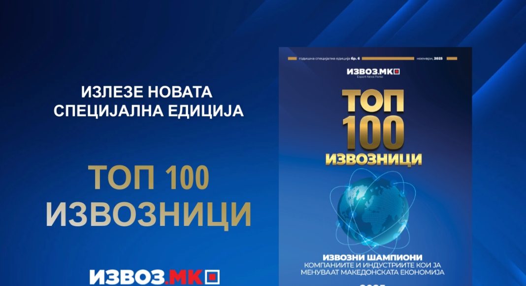Специјализираниот портал ИзвозМК ја издаде шестатa по ред специјална едиција „ТОП 100 ИЗВОЗНИЦИ 2025”, единствената публикација што ги рангира најголемите и најуспешни извозни компании во Северна Македонија.