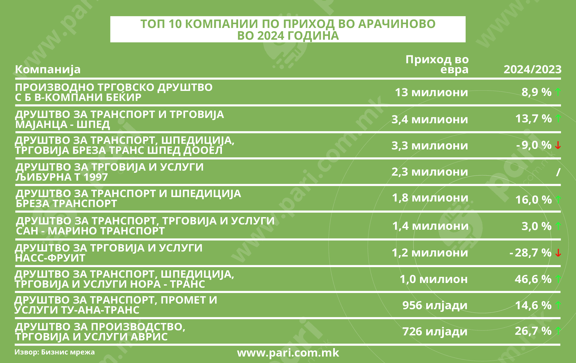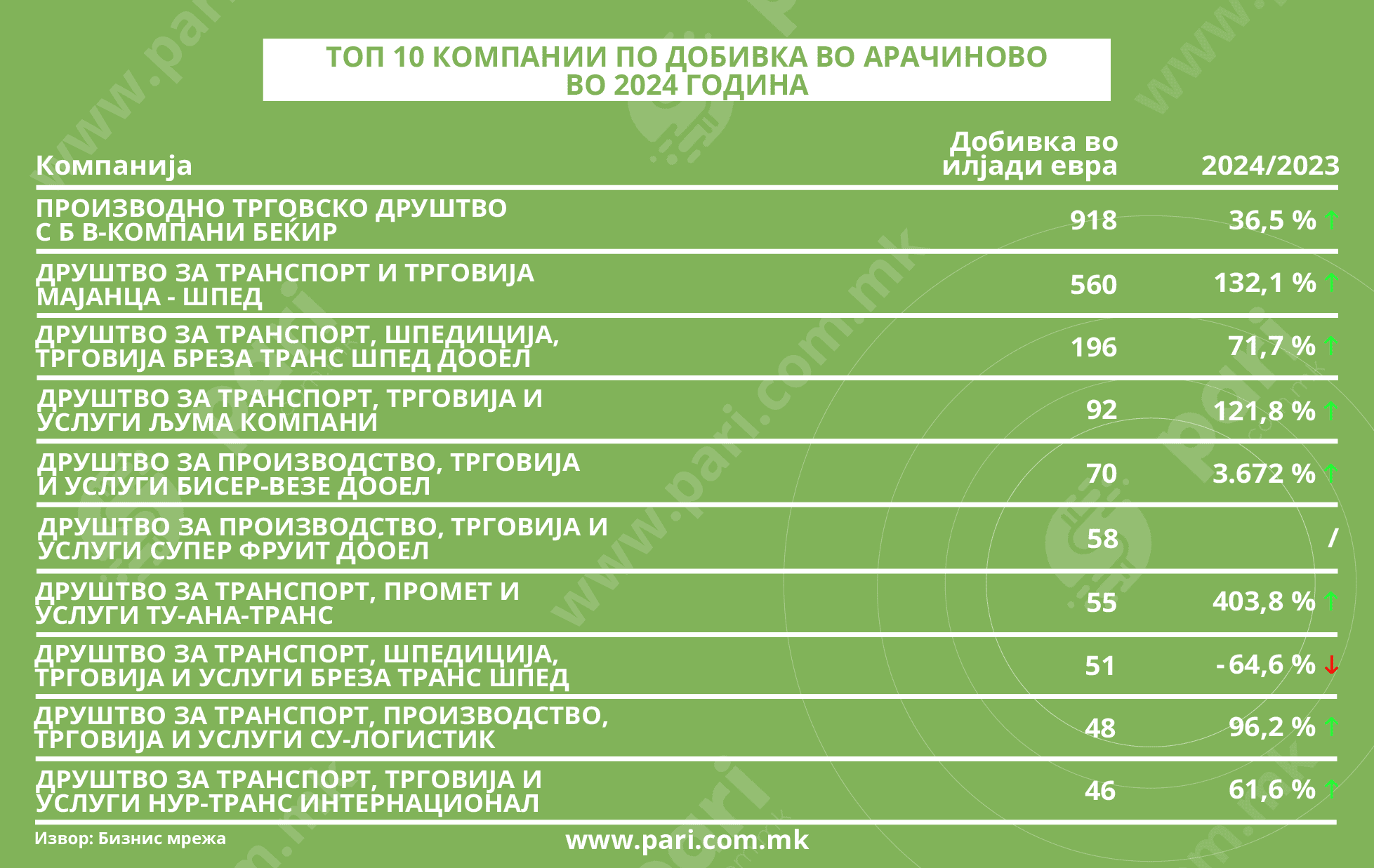 Податоците покажуват дека на бизнисот во Арачиново лани му одело подобро отколку во 2023 година. Сите компании, освен транспортно-шпедитерската БРЕЗА ТРАНС ШПЕД (пад на добивката од 64,6 насто), имале раст на добивките и тоа од 36,5 насто (С Б В-КОМПАНИ Беќир) до дури 3.672 насто (Друштвото за производство, трговија и услуги БИСЕР-ВЕЗЕ ДООЕЛ).