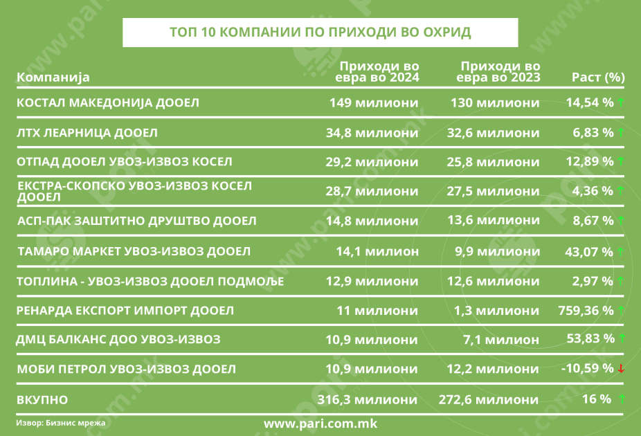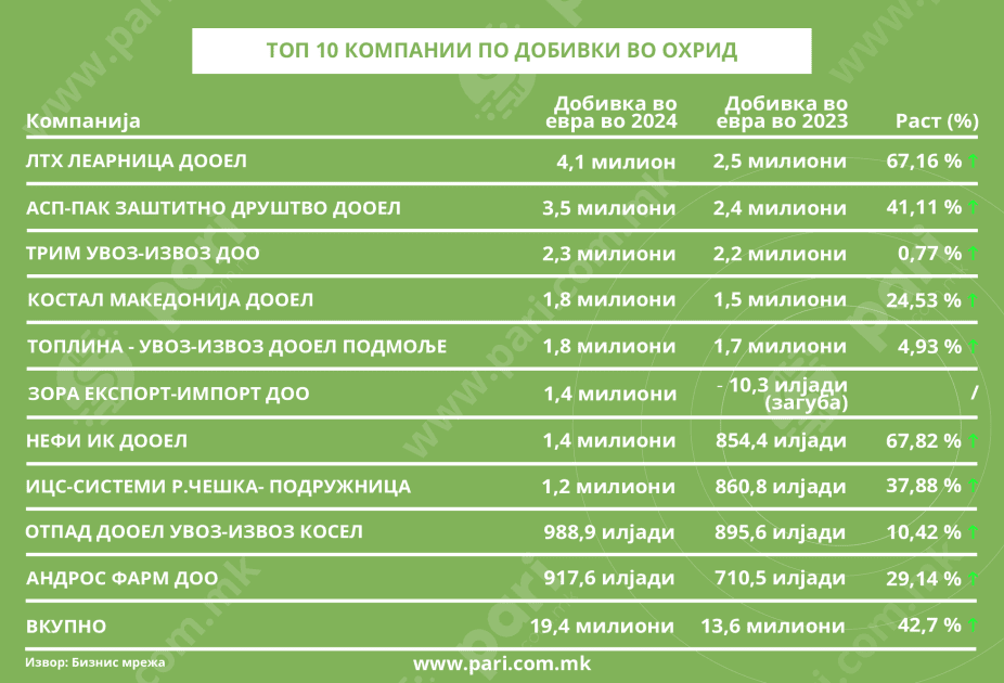 За 42,7 насто е повисока добивката на десетте најпрофитабилни компании од охридската територија и за 2024 година изнесува 19,4 милиони евра. Оваа сума има удел од 33 насто во вкупната добивка на сите над 2.800 компании.