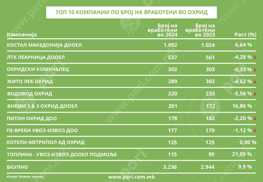 Охридските фирми им даваат можност за работа на повеќе од 12,6 илјади лица. Од нив, најголемите работодавачи лани обезбедиле 3.236 работни места (+ 9,9 %). Кај нив се 26 насто од сите вработувања. Сепак, треба да се напомене дека шест од десетте компании лани го намалиле кадарот.