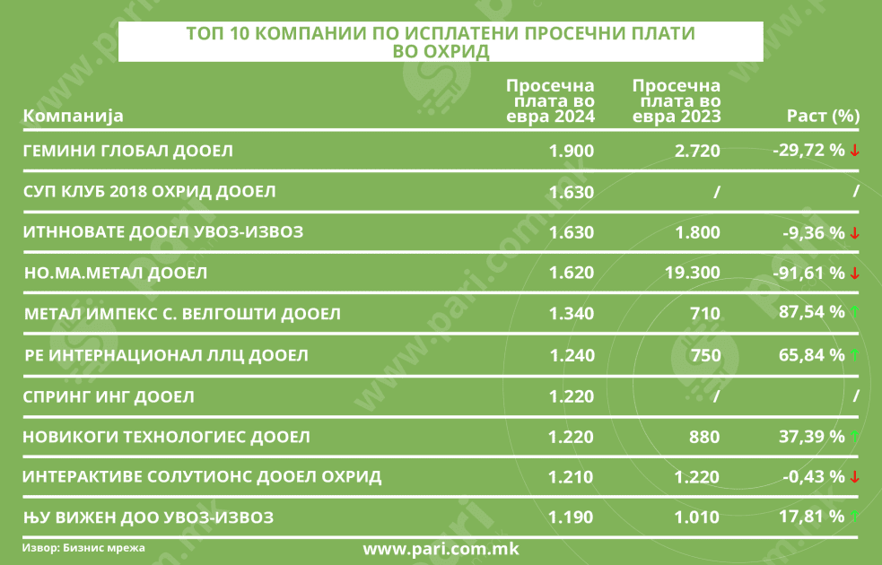 Фирмите што се издвојуваат по просекот на платите, воопшто ги нема на претходните листи. Тоа е и разбирливо, бидејќи се мали, со ангажирана моќност од 51 вработен. Во тие десет компании, лани просечните месечни примања биле во опсег од 1.190 до 1.900 евра.