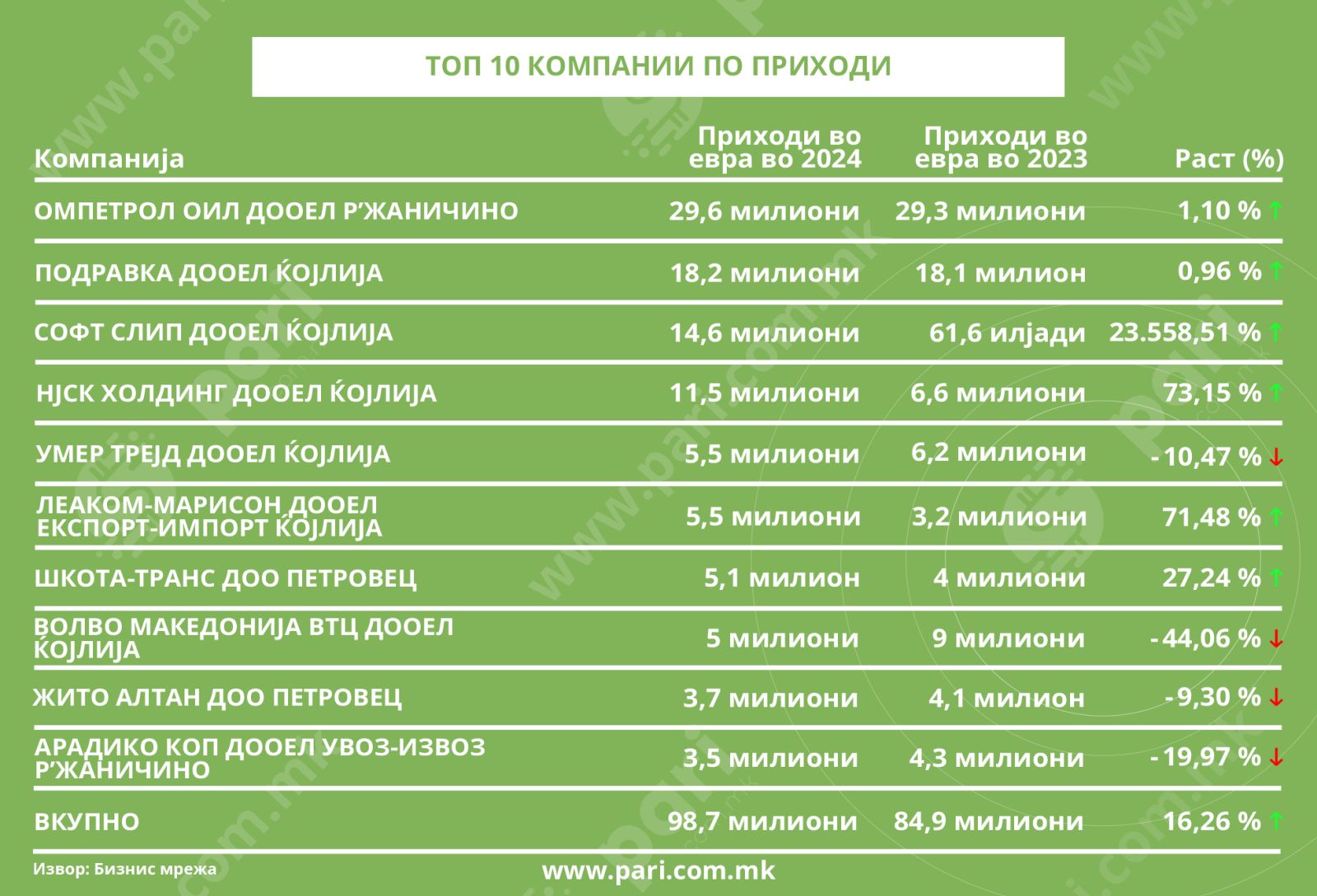 Овие десет компании лани оствариле вкупен приход од 98,7 милиони евра. Со тоа го надминале прекланскиот заеднички резултат (84,9 милиони) за 16,26 насто.