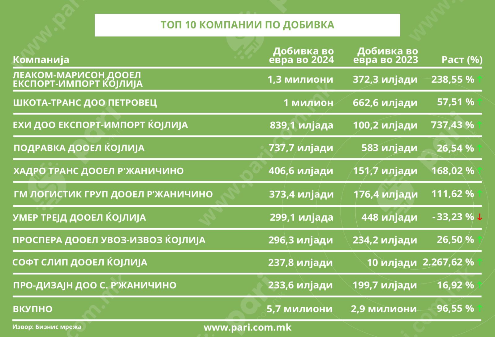 Не мора да е најприходен за да е најпрофитен. На оваа листа има и претходно неспоменати компании, а сите тие заедно имаат добивка од 5,7 милиони евра. Нивниот успех е за 96,55 насто поголем од 2023 година (2,9 милиони евра). Само една компанија имала пад во овој сегмент, Умер Трејд со 33,23 насто.