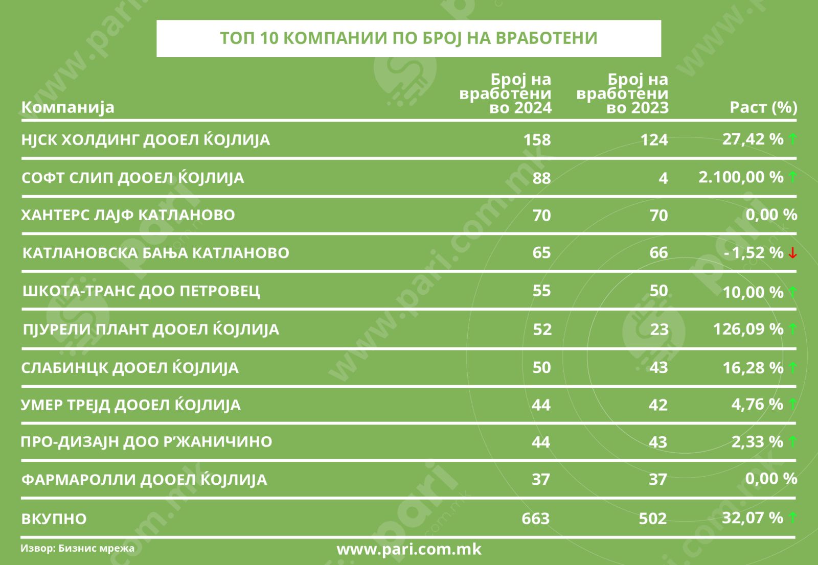 Нови имиња се среќаваат и кај десетте најголеми работодавачи во Петровец, кои ангажираат 663 лица. Бројната состојба е за повеќе од 32 насто подобра од прекланската.