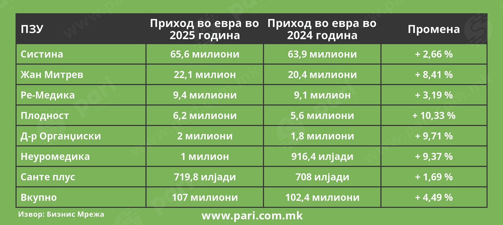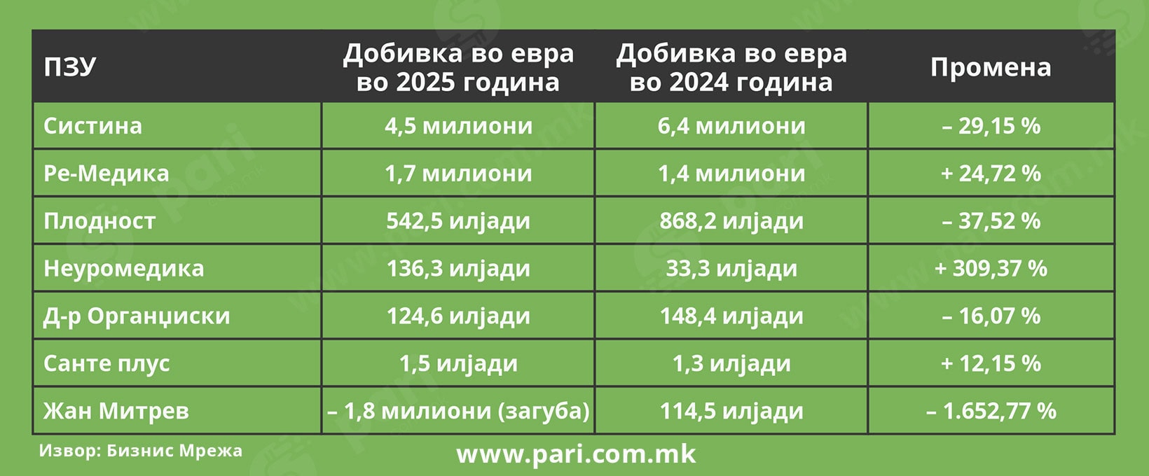 Најголемиот процентуален пад од 37,52 насто е регистриран во Плодност – од 868,2 илјади (2024 година) на 542,5 илјади евра (лани). Во оваа група е и Д-р Органџиски (– 16,07 %).