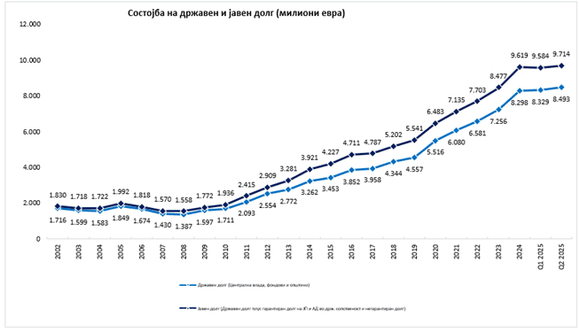 Во графиконот е прикажан државниот и јавниот долг на нашата држава. Во вториот квартал од 2025 година, вкупниот државен долг на Република Северна Македонија изнесува 8.5 милијарди евра. Од друга страна пак, вкупниот државен долг на САД изнесува неверојатни 36.7 трилиони долари. Па, од каде доаѓаат тие дополнителни пари?